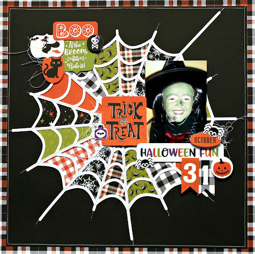 Halloween layouts are so much fun. We always go all out with the costumes at Halloween. My daughter made the cutest little witch ever! I backed the cut file with pattern papers from this collection. Then I put it on a black background so it would stand out. I also stitched the web to make it look more realistic.